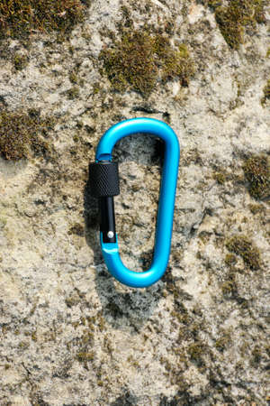 Climbing sports image of a carabiner on a rope . Climbing concept