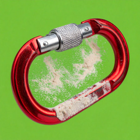 A close-up of a well-used red climbing carabiner, dusted with chalk from a recent ascent.