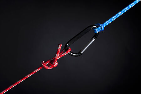 red and blue ropes connected with carabiner hook