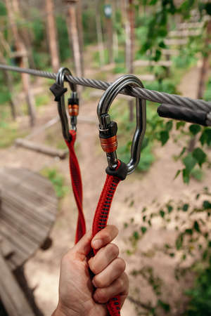 Rope park. The hand hooks the carabiners to the belay line. Close-up