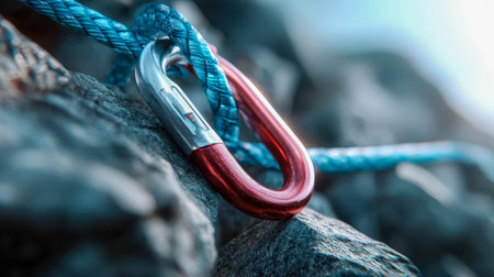 Close-up of a red and silver carabiner attached to a blue rope on rocky surface, symbolizing climbing safety and adventure.