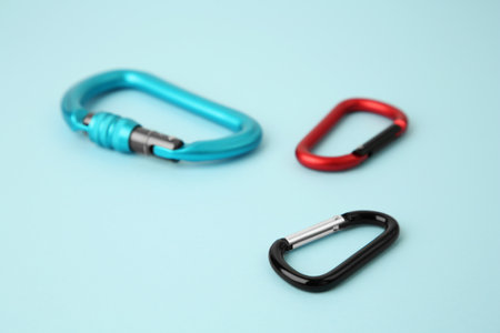 Metal carabiners on light blue background, closeup