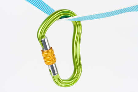 New green HMS carabiner, screw lock snap hook, climbing equipment on sewn loop sling on white background