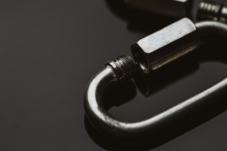 one metal carabiner on a dark background.