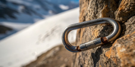 A sturdy carabiner glistens on a rocky face, with snowy peaks in the summer sun.