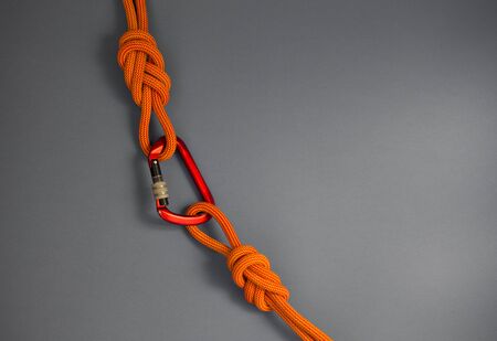 Rope with a secure knot and carabiner. Equipment for rock climbing and mountaineering. reliable connection. Safety rope. concept of reliability and durability.