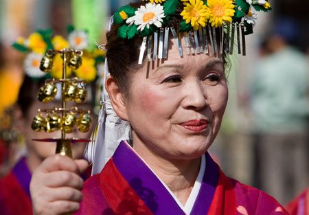 Kagoshima City, Japan, October 28, 2007. A woman in red yukata kimono and wearing flowers in her hair shakes bells during the Taniyama Furusato Matsuri dance festival.
