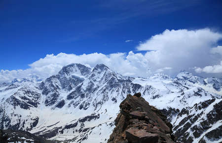 Snow in the summer on high mountains. Blue sky in the clouds. Elbrus