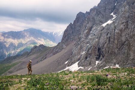 Hiker reaching the big rock in mountains. Kazakhstan, Almaty.