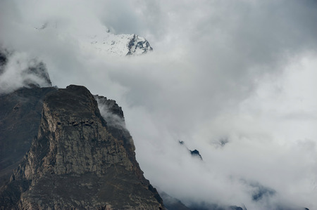 Panoramic view of Himalaya mountain range with snow and fog