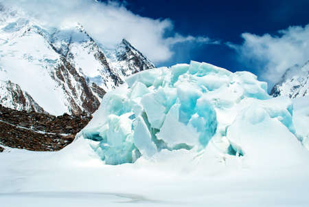 Winter landscape with glacier in Karakorum mountains, Pakistan. Snow valley with hills of ice