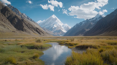 This stunning image captures a tranquil river flowing through a rugged valley, framed by majestic snow-capped mountains and a vibrant blue sky, perfect for nature lovers.