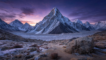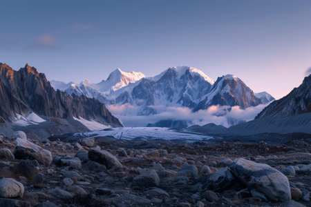 The image showcases a stunning mountain landscape dominated by towering, snow-capped peaks. The composition reveals a rugged terrain with a focus on the textured foreground. The cool color palette, accentuated by the vibrant hues in the sky, suggests an atmospheric daytime setting. This imagery can be employed for various commercial or editorial applications.