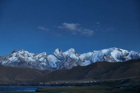 Beautiful scenery of white peaks mountains under night sky full of stars near Kel Suu Lake in Naryn region, Kyrgyzstan