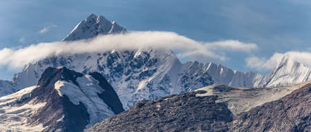 Beautiful panoramic view of a mountain peak covered with ice and snow, surrounded with fluffy couds in Alaska. Blue sky as a background.