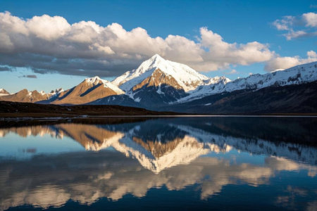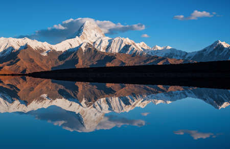 The reflection of the tranquil snow-capped mountains and lakes, the scenery of the lakes and mountains under the holy snow-capped mountains