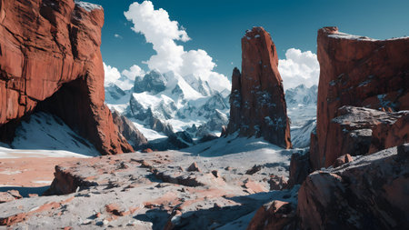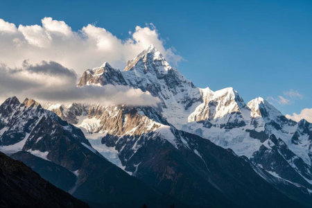 Breathtaking view of a dramatic mountain range with snow-capped peaks, rugged terrain, and fluffy clouds overhead, perfect for nature enthusiasts and explorers.