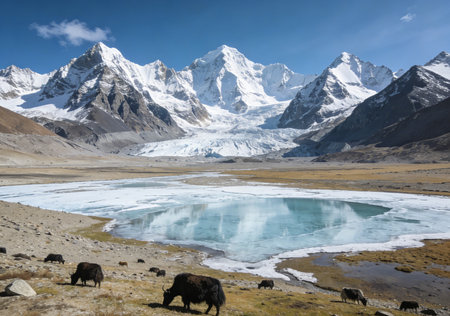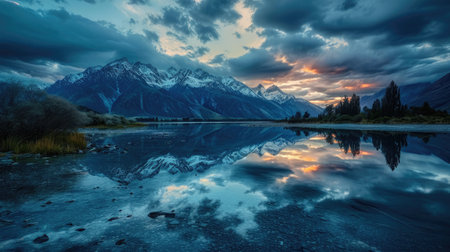 A scenic landscape showcases snow-covered mountain peaks mirrored in a serene lake. The composition displays a vivid display of colors, featuring blues and whites. This image evokes a sense of tranquility. It is suitable for various commercial uses, including travel promotions and nature-themed projects.