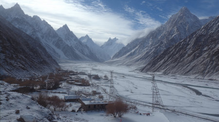 A serene winter scene with a village nestled in the mountains and power lines crisscrossing the landscape.