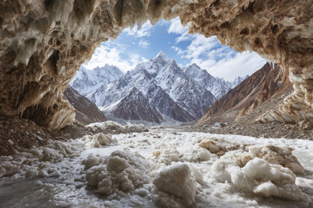 An image reveals a mountainous landscape viewed through a glacial cave opening. The scene features snow-covered peaks under a bright blue sky with clouds. The foreground shows ice formations within the cave, with a composition that emphasizes depth. It could be useful for travel publications, environmental reports, or scenic backgrounds.