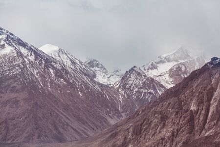 Snowy mountain peaks under brooding sky evoking cold beautiful melancholy
