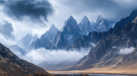 Explore a stunning photo showcasing snow-capped mountains looming under dramatic clouds, featuring a rugged landscape that highlights nature's vast beauty and tranquility.