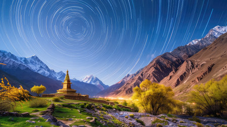 A stunning view of a tranquil temple set against majestic mountains and star trails, creating a serene atmosphere perfect for nature lovers and travelers.