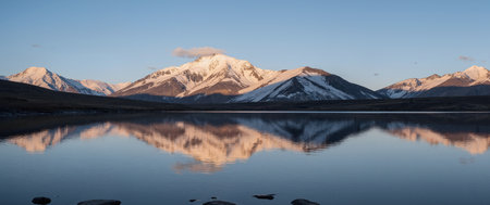A stunning landscape presents a towering mountain range with snow-capped peaks. The scene captures the mountains reflecting perfectly in a tranquil body of water. The composition highlights the natural beauty with a vivid blue sky. This image is suitable for various commercial uses, including travel promotions.
