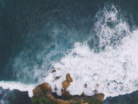 Waves and rocks as a background from top view. Blue water background from top view. Summer seascape from air.