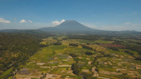 Aerial view Farm fields near the volcano Agung, rice terrace, farmlands, village, fields with crops, agricultural land of farmers. Bali, Indonesia.