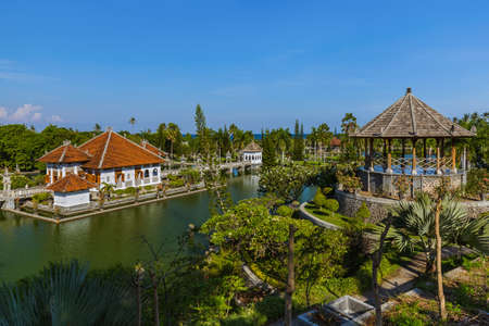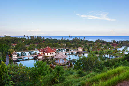 Panoramic view of the Royal water palace in Taman Ujung park which is situated near the ocean, Bali, Indonesia