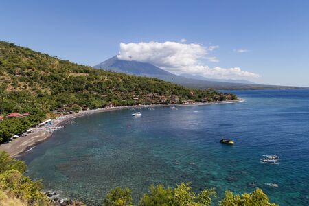 Scenic view of a Amed Bay in Bali with the volcano Mount Agung in the background.