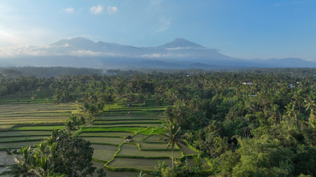 Rural view of terraced Rice field with Mountain on the background in the morning. The Mountain named Mount Sumbing. Kajoran rice field, Central Java, Indonesia