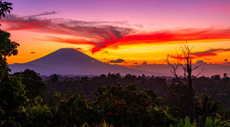 Beautiful sunset over the volcano Agung in Bali, Indonesia