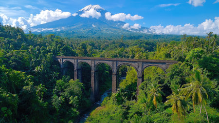 Experience the breathtaking beauty of an ancient bridge nestled in lush green surroundings, with a majestic mountain towering in the background.