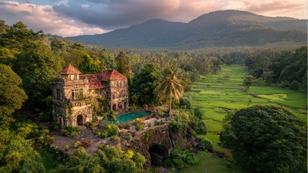 Panoramic view of a villa in the middle of the jungle