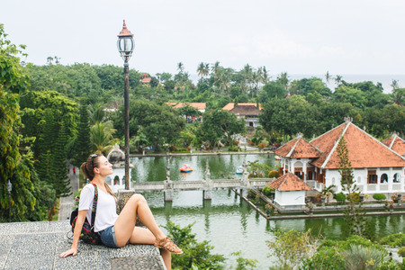 Young beautiful woman in Taman Ujung water palace, Bali island, Indonesia