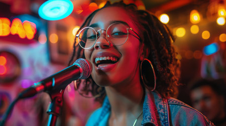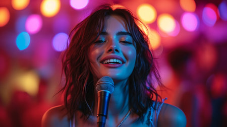 Smiling woman singing passionately with sparkling microphone in vibrant neon lit setting during lively night music performance.