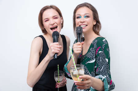 Portrait of two singing girls with glasses in their hands. Karaoke concept. Mixed media