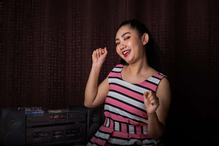 Young Asia woman in retro fashion yellow dress holding a cassette tape on a white background