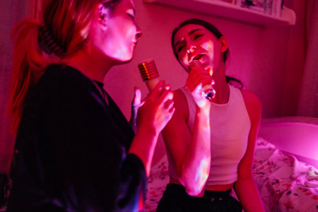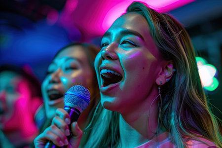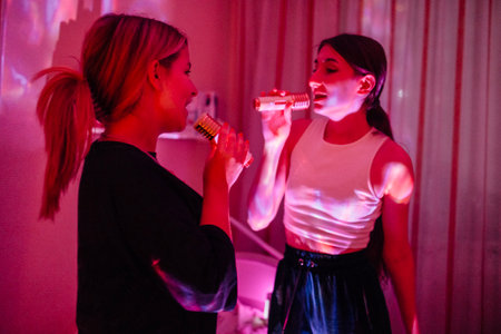 Two young women are having fun singing karaoke in a private room with colorful lights. They are both smiling and holding microphones.
