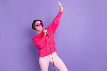 Photo of young attractive girl happy positive smile sing microphone karaoke isolated over violet color background