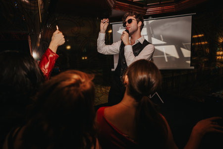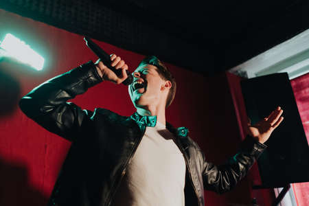 emotional caucasian singer male chave fun in karaoke bar, singing in microphone, rocking and chilling out in singers club.