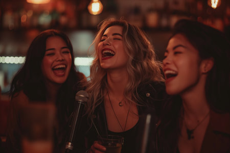 Three friends laughing and singing together in a cozy bar, enjoying drinks and each others company
