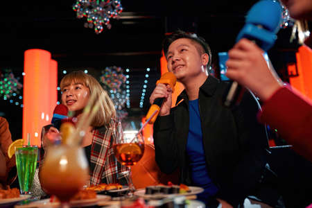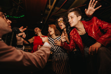Multi-ethnic group of happy young people singing karaoke in a nightclub