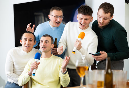 Happy male friends having fun while singing karaoke at a bar. Having fun, celebrating. holiday, leisure, party concept