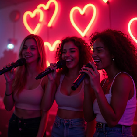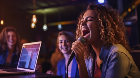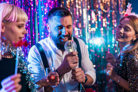 Group of friends singing and dancing at a lively night out, having fun together tonight