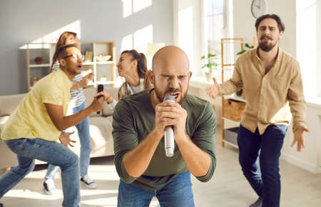 Karaoke at home. Emotional young man holding a microphone and enthusiastically singing while having fun with friends at home. Man sings against background of friends who also sing and have fun in room