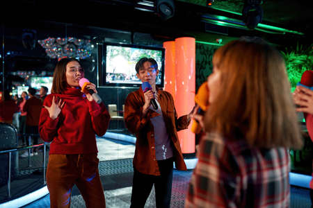 holiday, party,celebration concept. young people have cheerful pastime in karaoke, positive people together sing in microphone and have fun, chilling out
