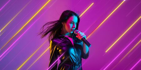 Caucasian female singer portrait isolated on purple studio background in neon light. Beautiful female model in black wear with microphone. Concept of human emotions, facial expression, ad, music, art.